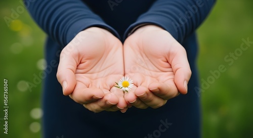 Delicate Daisy Held Gently in Open Hands Against Green Background
