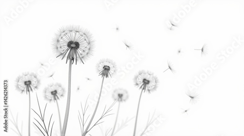 Delicate dandelions stand tall against soft white background, their seeds gently drifting away, creating serene and peaceful atmosphere