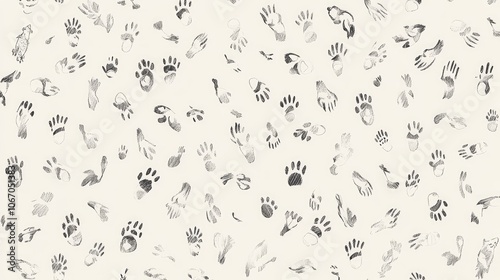 Delicate doodles of various animal footprints on a light, neutral background, providing a subtle and endearing pattern for a fun and inviting look.
