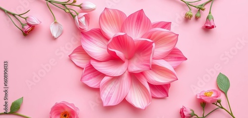 Delicate eustoma petals form a unique paper sheet on a soft pink background Flat lay, floral, decorative card, petal, texture