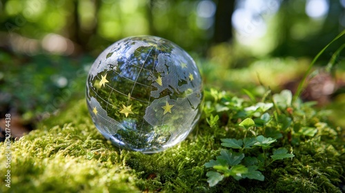 Delicate Glass Globe Resting on Vibrant Green Moss, Reflecting a Healthy Forest Ecosystem