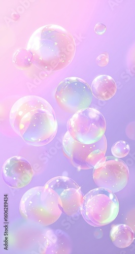 Delicate, iridescent soap bubbles float in a soft pastel background