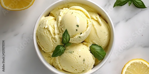 Delicate lemon basil gelato in a white bowl, featuring creamy yellow scoops garnished with fresh green basil leaves, surrounded by lemon slices.
