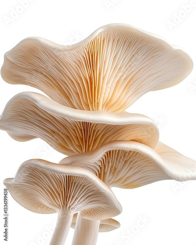Delicate oyster mushrooms display their elegant, layered caps, showcasing intricate gills and smooth surfaces. Perfect for culinary or botanical themes.