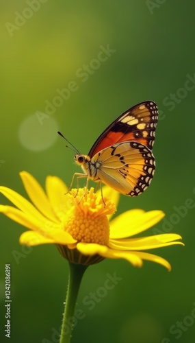 Delicate painted lady butterfly on bright yellow daisy, bokeh background , colorful, closeup