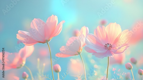 Delicate pastel flowers sway gently in a soft breeze, creating a serene and dreamy atmosphere perfect for nature lovers.