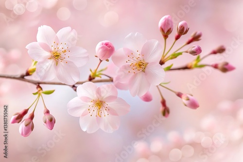 Delicate pink cherry blossoms in full bloom, a gentle springtime scene bathed in soft light and a dreamy, blurred background.