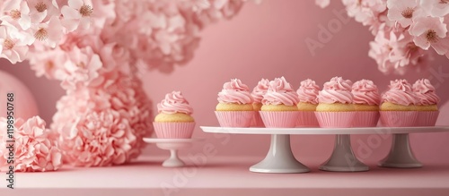 Delicate pink cupcakes arranged on elegant pedestals against a soft pastel backdrop adorned with blooming flowers, ideal for whimsical bakery presentations.