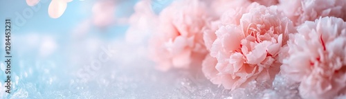 Delicate pink peonies and hydrangeas are encased in crystal-clear ice, illuminated by soft glowing light, creating a surreal and luxurious winter floral arrangement with an ethereal atmosphere