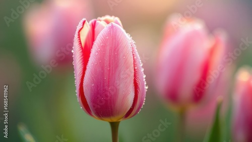 Delicate Pink Tulips Covered in Morning Dew Drops Soft Focus Background