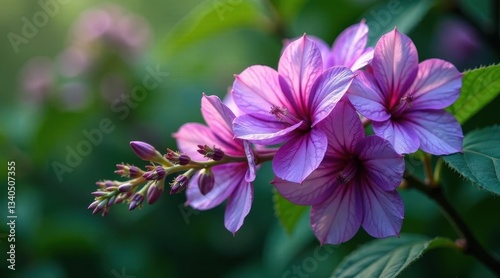 Delicate Purple Blooms in Soft Sunlight, Glowing Petals Unfurling, Nature's Gentle Beauty