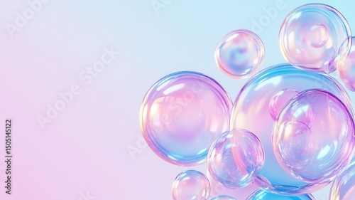 Delicate soap drifting bubbles across soft pink backdrop, reflecting shimmering iridescent colors in ethereal, whimsical composition