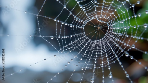 Delicate spider web glistens with dew drops near beautiful waterfall in indigenous territory, showcasing nature intricate artistry