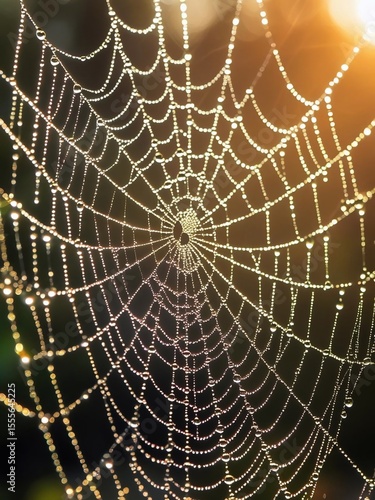 Delicate spiderweb adorned with sparkling morning dew bathed in golden light