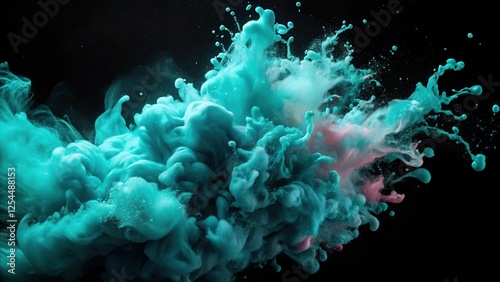 Delicate turquoise ink splatters on black paper background, macro photography showing intricate patterns and textures