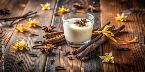 Delicate vanilla flower pods scattered on a wooden surface with milk splash and warm spices, creating a sense of serenity in the kitchen, rustic, culinary art