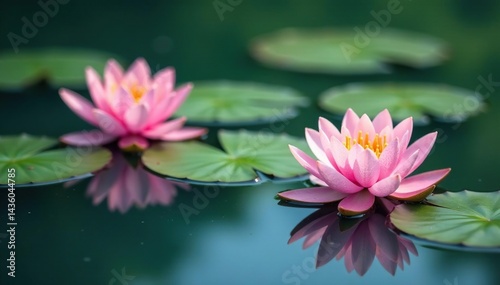 Delicate water lilies forming a floral pattern on a still lake surface, tranquil, water lilies