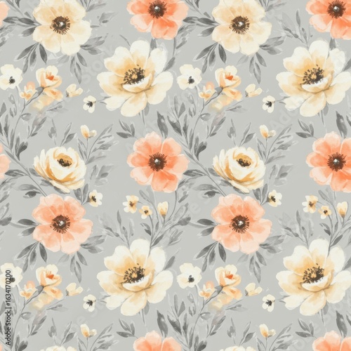 Delicate watercolor floral pattern with peachy and creamy blooms on a subtle gray background isolated on white background
