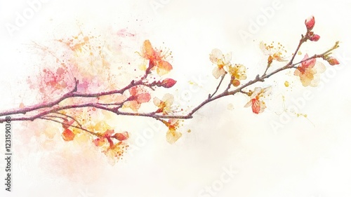 Delicate watercolor painting of blossoming branch with subtle pink and yellow hues