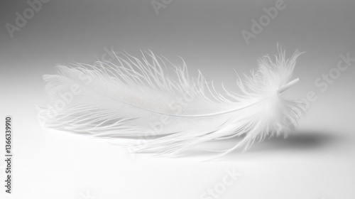 Delicate white feather rests gently on plain white surface. Feather soft texture, elegant shape highlighted by pure white background. Simple composition, soft light create peaceful aesthetic. Single