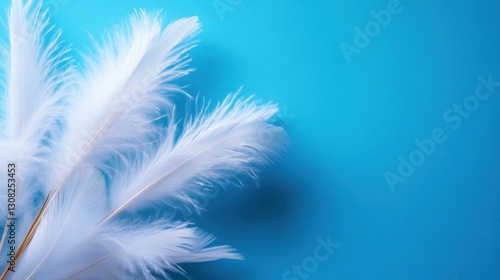 Delicate white feathers are arranged thoughtfully on a vibrant blue backdrop, creating a serene and artistic composition that captivates the eye