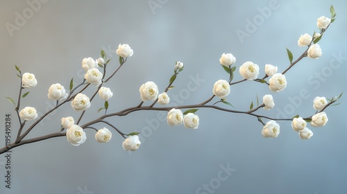 Delicate white flowers on branch against soft gradient background