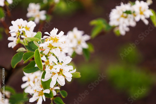 Delicate white flowers with yellow stamens bloom against a blurred brown and green background. Small green leaves look fresh next to the numerous flowers, creating a feeling of spring and renewal.