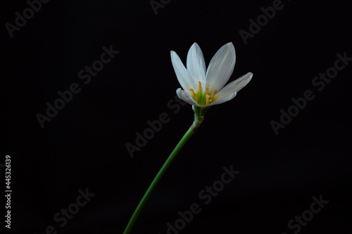 Delicate white Zephyranthes flower, also called fairy, rainflower, zephyr, magic and rain lilys. Close-up. Isolated on a black background.