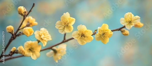 Delicate Yellow Blossom Branch Against a Soft Blue Background Bringing a Sense of Calm and Natural Beauty in Springtime Settings