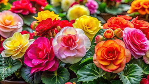 Delicate yet vibrant begonias unfurl their petals in a kaleidoscope of colors, showcasing the intricate beauty of each bloom in intimate close-up.