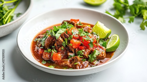 Delicious and Flavorful Beef Stew with Fresh Vegetables and Herbs in a White Bowl