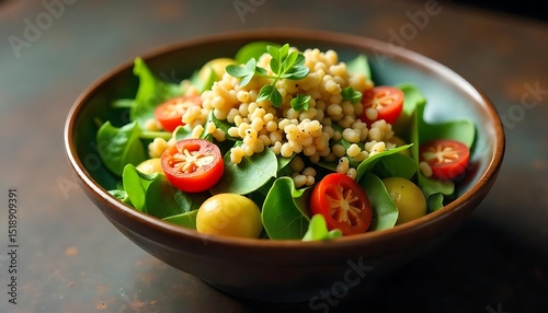Delicious and healthy couscous salad with fresh tomatoes and spinach in a rustic bowl a perfect vegetarian meal