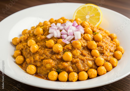 Delicious and Spicy Chana Masala: A Popular Indian Chickpea Curry Dish Served with Onion and Lemon