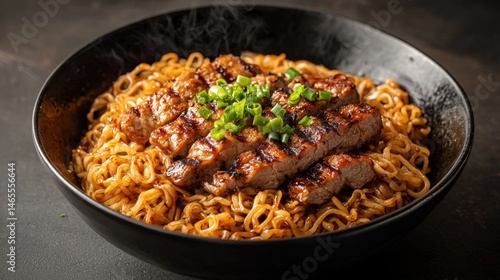 Delicious Asian-style instant ramen noodles with grilled beef slices topped with chopped green onions served in a black bowl on a dark background