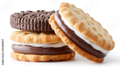Delicious assortment of biscuits and double-decker cookies featuring chocolate cream filling on a white background