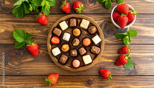 Delicious Assortment of Chocolates and Fresh Strawberries on Rustic Wooden Table
