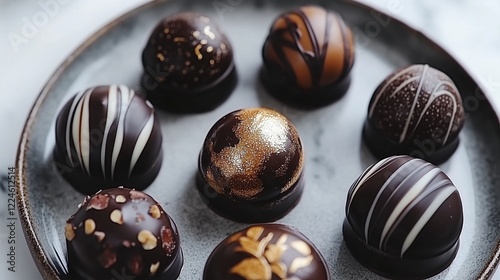 Delicious assortment of handcrafted chocolates arranged on a decorative plate at a cozy dessert shop