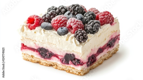 Delicious Berry Cake Slice with Creamy Frosting on a White Background