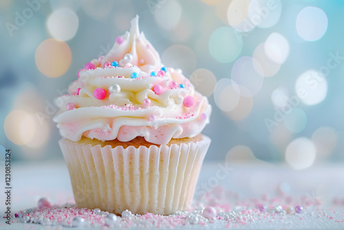 Delicious birthday cupcake on a table with bokeh background. High quality photo