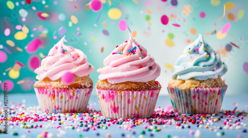 Delicious birthday cupcake with lit candles, decorated with colorful sprinkles, creating a festive and joyful atmosphere