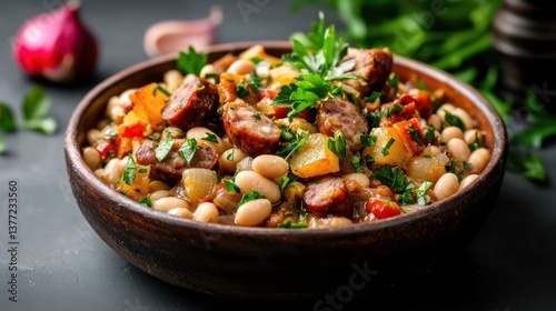 Delicious Bowl of Beans and Sausages with Fresh Parsley Garnish Served