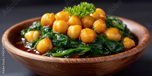 Delicious bowl of chickpea and spinach stew garnished with fresh herbs ready to serve as a nutritious and flavorful comfort food meal