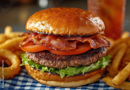 Delicious burger with crispy bacon, fresh lettuce, juicy tomato, and golden fries on checkered tablecloth with refreshing drink in the background
