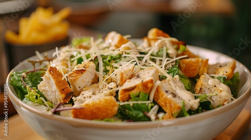 Delicious caesar salad topped with bread and chicken cheese vinaigrette