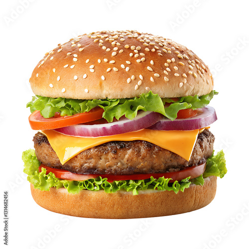 Delicious Cheeseburger, Hamburger with Lettuce, Tomato, Onion, and Sesame Bun on Transparent Background