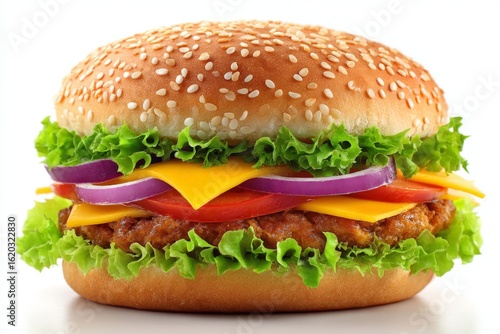 Delicious cheeseburger piled high with fresh ingredients and a toasted sesame seed bun