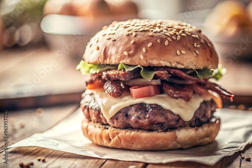 Delicious Cheeseburger with Bacon and Sesame Seed Bun.