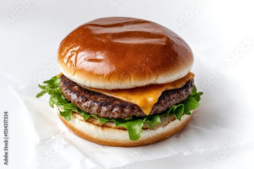 Delicious cheeseburger with fresh lettuce and melted cheese on a white background