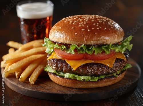 Delicious cheeseburger with fresh lettuce and tomatoes served with golden french fries and a cold beverage on a rustic wooden table