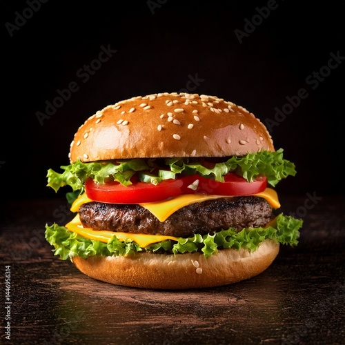 Delicious cheeseburger with lettuce and tomato on sesame bun